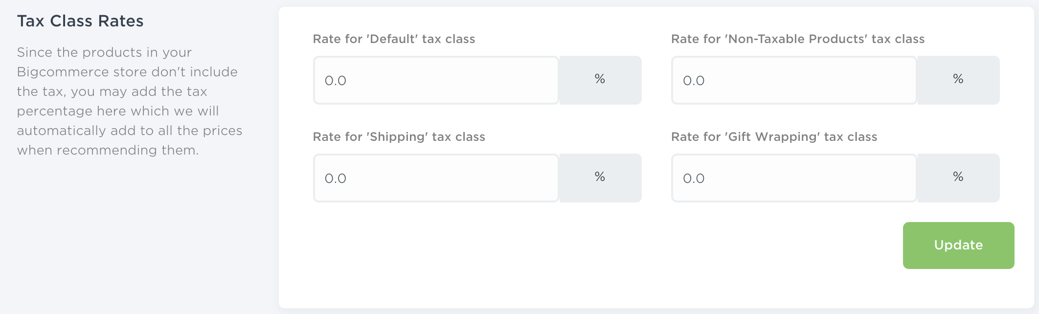 Tax rates for each tax class can be configured from the Nosto app's settings page in the BigCommerce admin. Go to Apps > Nosto and then go to the Settings tab. You will find the tax section at the bottom of the page.