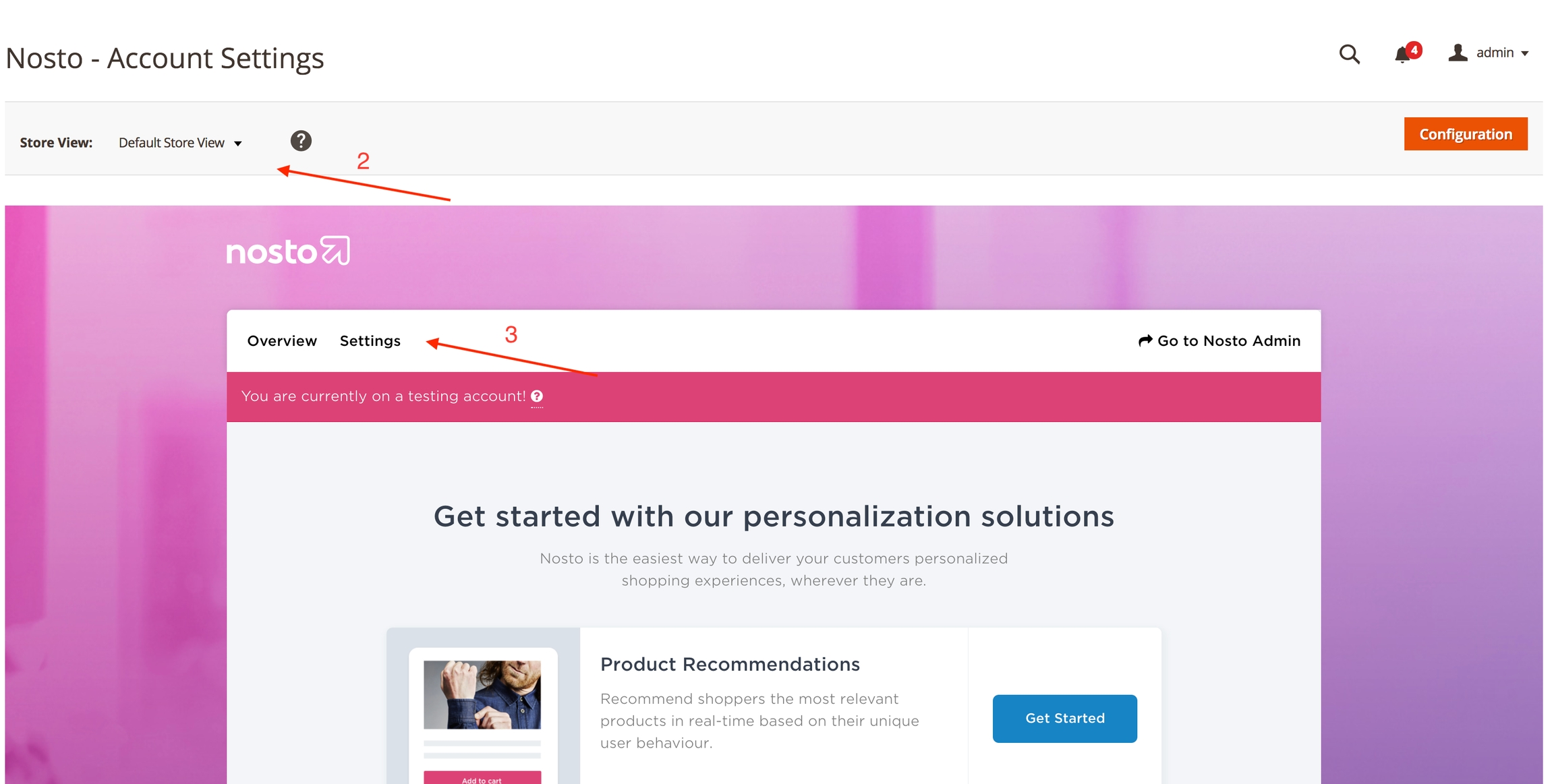 To remove your previously connected Nosto account from Magento, head to Nosto configuration panel as you can see in the screenshot below. Select your store view, then head to the Settings tab in the iframe.