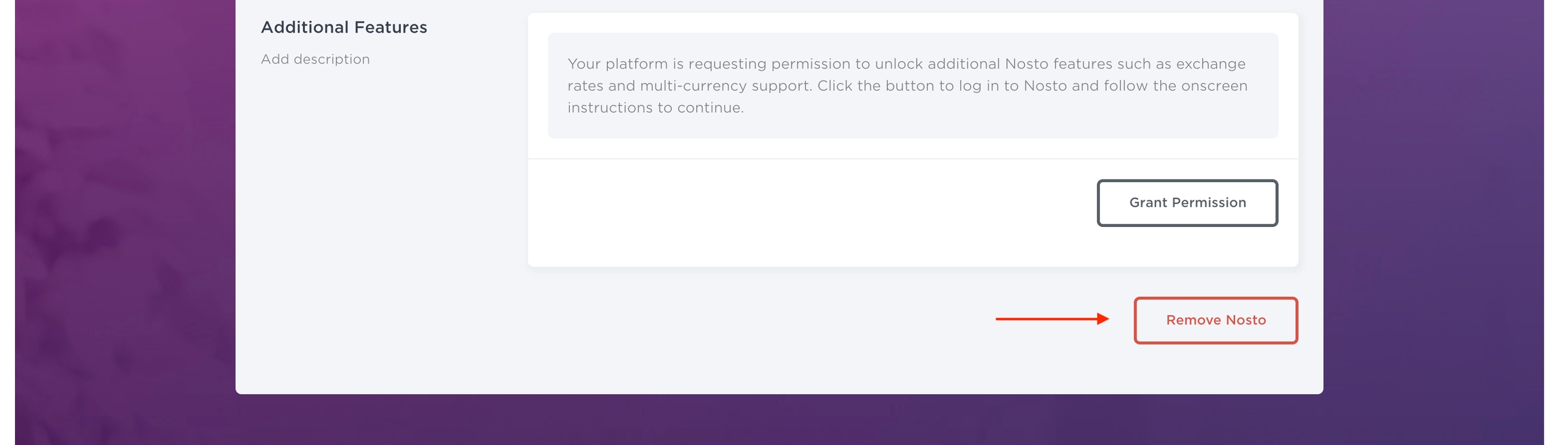 In the settings tab, scroll to the bottom of the page and simply hit the Remove Nosto button, so your account gets disconnected from the selected store view.