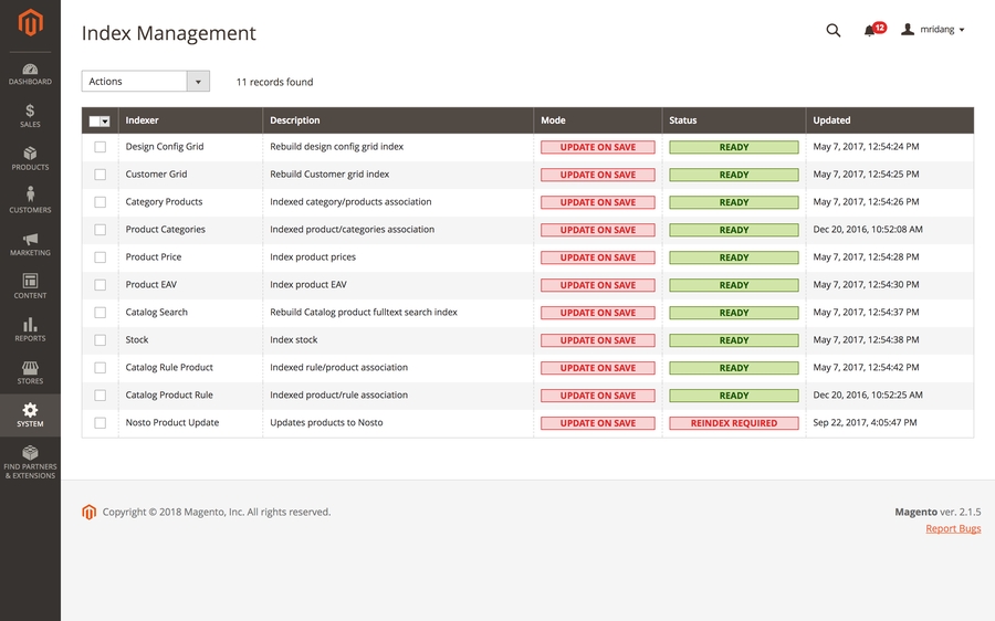 The indexer can be used drastically improve the performance of synchronizing the product catalog with Nosto. The indexer can be found by navigating to the Index Management view in the Magento settings.