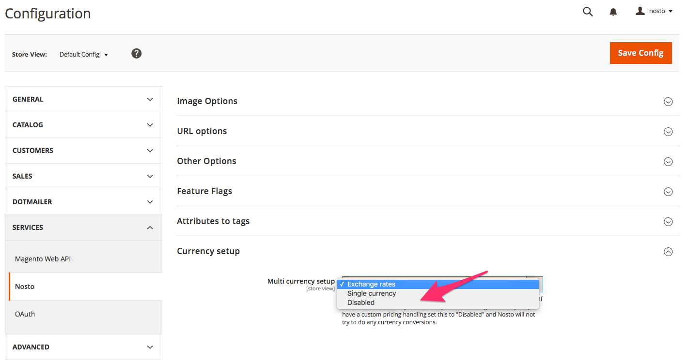 If your store view allows retailers to purchase in multiple currencies, the extension will automatically begin using the exchange rates. From version 2.10.0 you can also disable multi currency features and Nosto will not try to do any currency conversions for product prices. If your store view allows purchases only in one single currency you can set the multi currency method to be "Single currency" and Nosto will convert all product prices to that currency using the exchange rates saved in Magento.