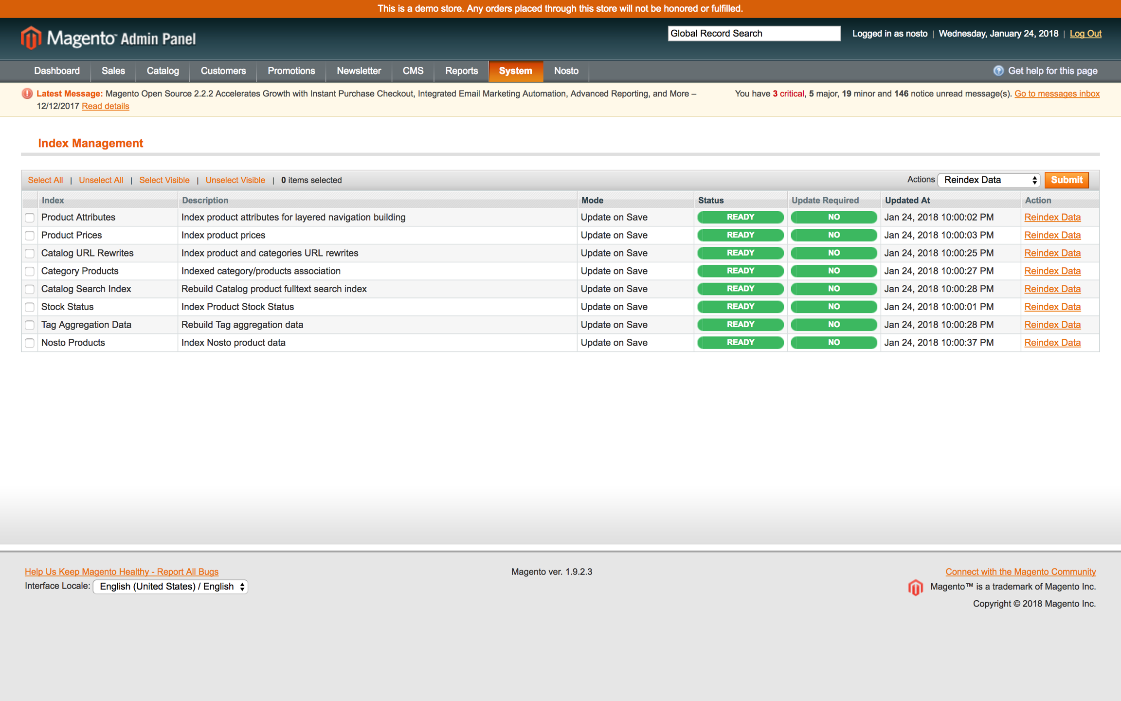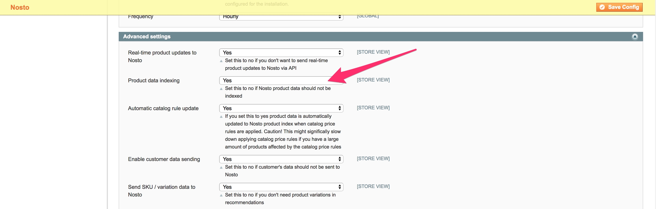 The indexer can be used drastically improve the performance of synchronizing the product catalog with Nosto and also generating the product tagging in store front. The indexer can be found by navigating to the Index Management view in the Magento settings.