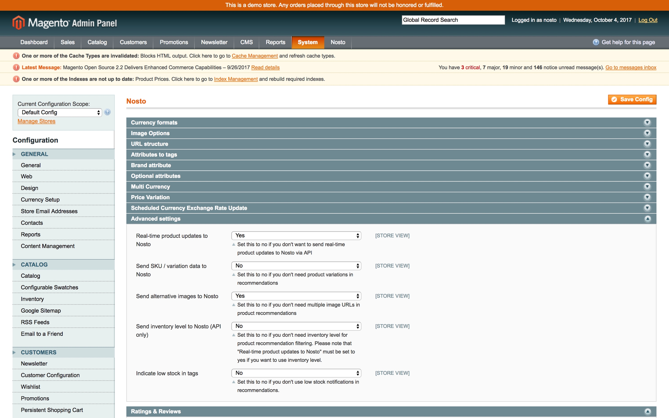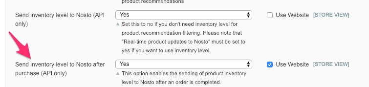 The inventory-level metadata collection is disabled by default. You can toggle the inventory-level metadata collection by navigating to the configuration page and toggling Send inventory level to Nosto under the Advanced settings section.