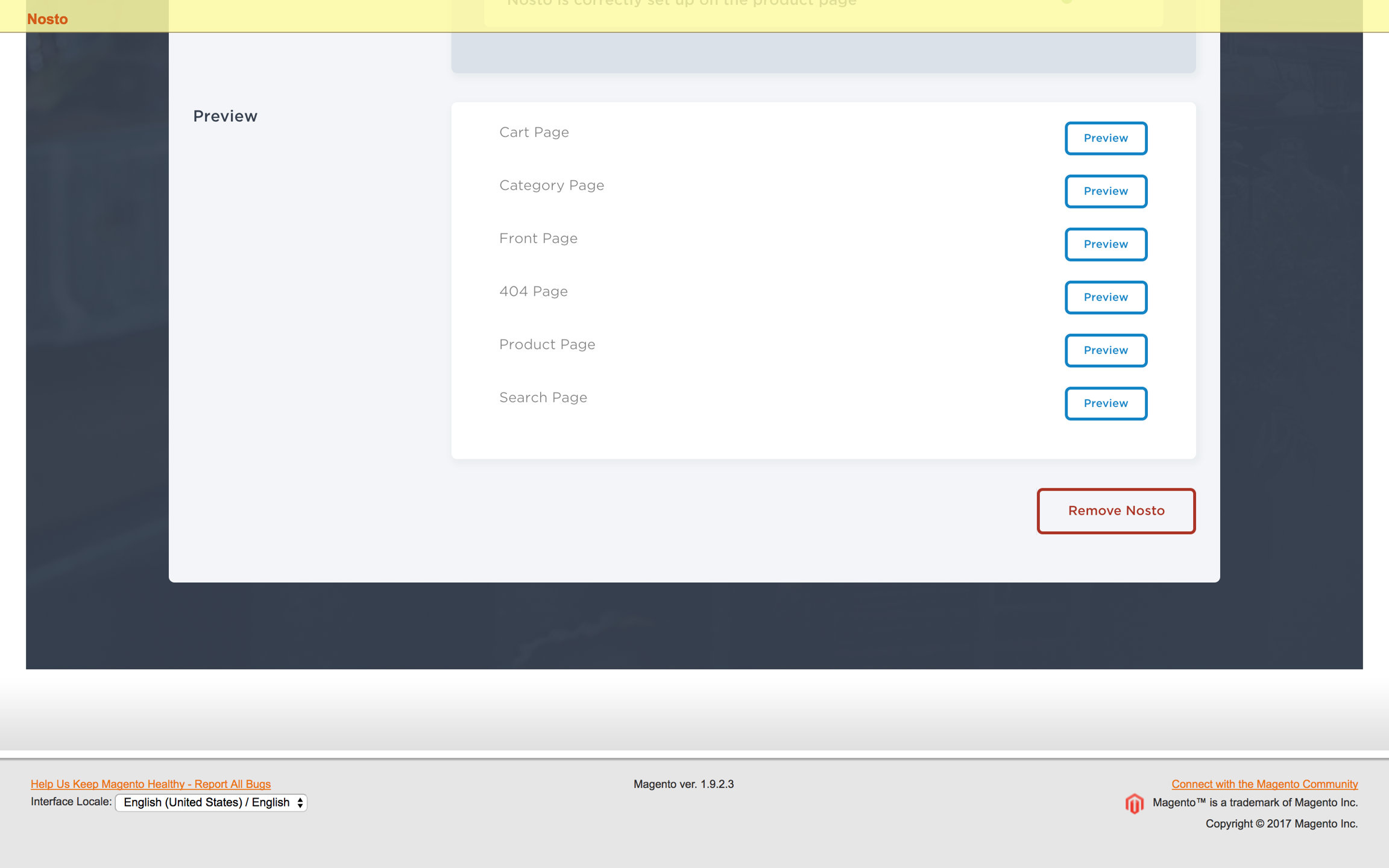 Under the Settings menu, click Remove Nosto. This will revoke all authentication tokens for that store-view and prevent any markup or scripts from being rendered on the frontend. While observers and layout handles are still registered, Nosto ceases to function for that store-view.