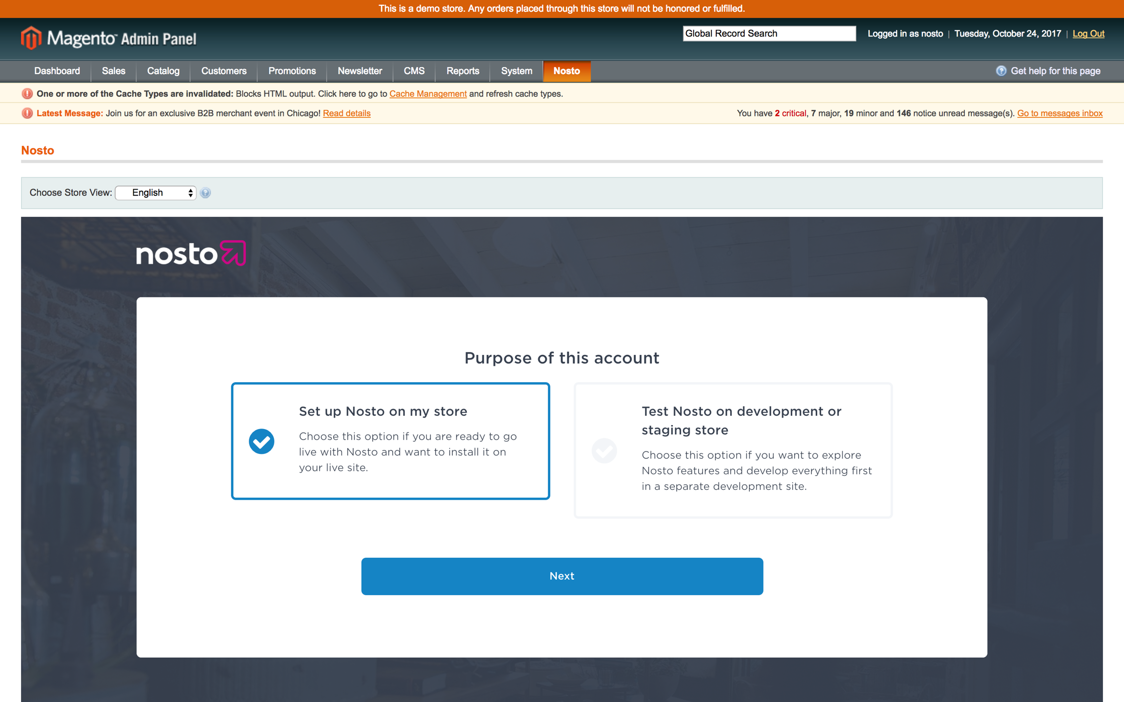 Select Set up Nosto to my Store, if you are installing Nosto on a live production environment and if you don’t already have an existing Nosto account. Please note you need one account for each store-view