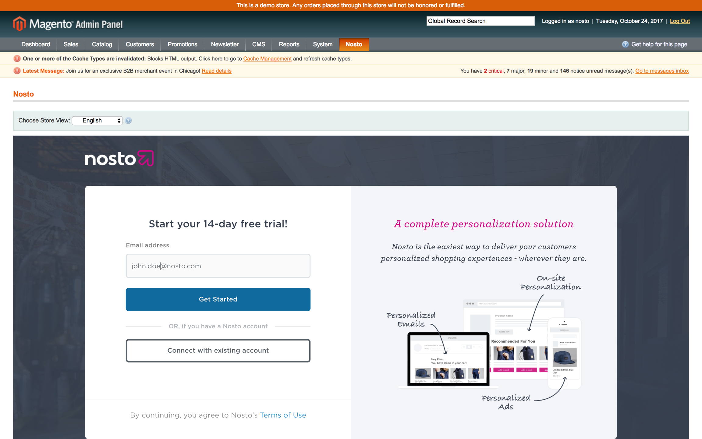 Connect a store view by selecting Nosto menu in the top bar. Proceed by selecting a store view, which you would like to connect to Nosto. The connection wizard will ask you a couple of questions about you, your store and its inventory before the connection is established. Connection steps will also open a Nosto account or require you to connect to an existing one.