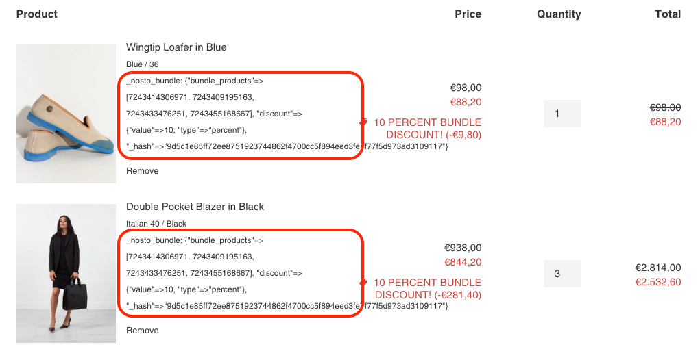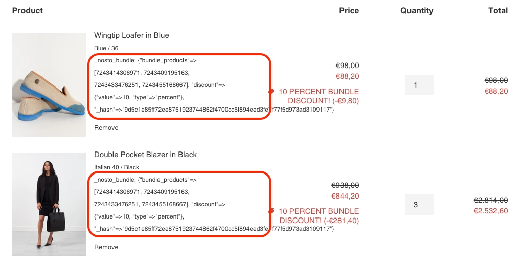 # ================================================================ # Testing block. Uncomment the following lines to test the script #Input.cart.line_items.each do |line_item| # new_properties = { '_nosto_bundle' => { 'discount' => { 'type' => 'percent', 'value' => 10 }, 'bundle_products' => ["PROD_1", "PROD_2"], '_hash' => 'GET_FROM_DEV_CONSOLE' } } # line_item.change_properties(new_properties, { :message => "" }) #end # ================================================================