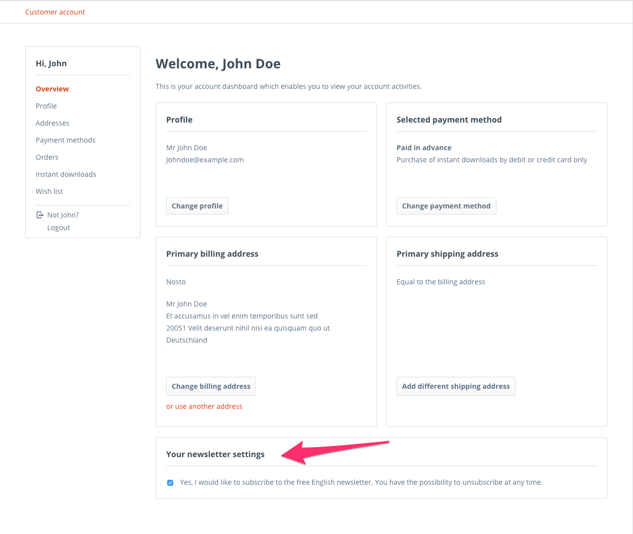 By default Nosto's extension uses Shopware's newsletter subscription as a source of information for populating this field. In other words, if a customer is also a newsletter subscriber marketing_permission field will be set to true and Nosto considers that the customer has given GDPR compliant marketing permission consent. If a customer is not a newsletter subscriber marketing_permission field will be set to false and Nosto considers that the customer has not given GDPR compliant marketing permission.