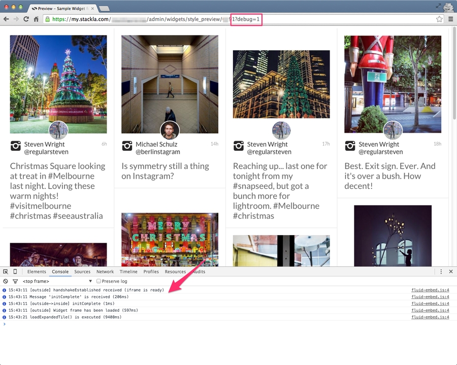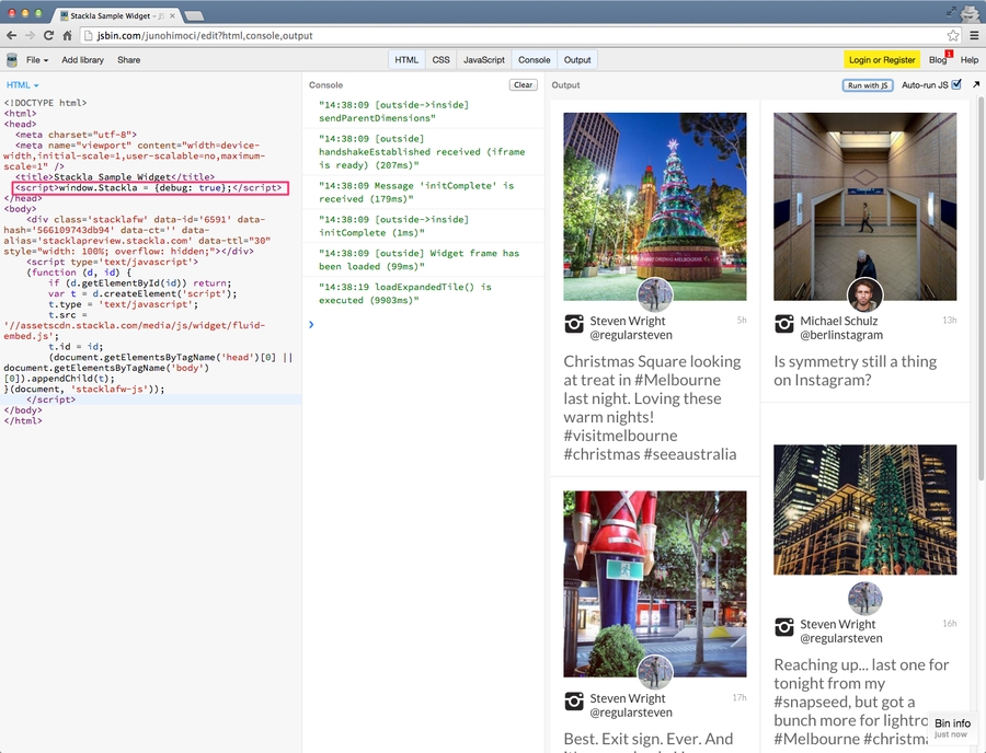 <script>window.Stackla = {debug: true};</script>Use the Code Editor
