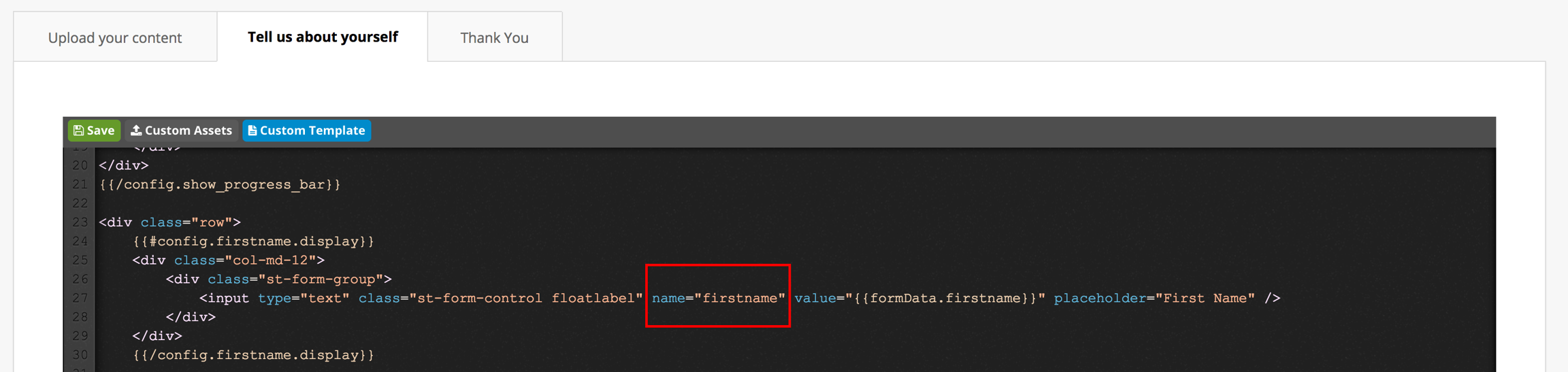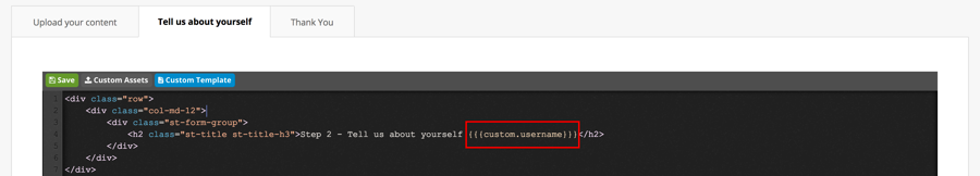 Now to render the custom plain text values, we need to enclose the custom data with three braces on either side and include the value custom.. Parameter is the unique identifier we have defined in the embed code. For example, using are example of data-custom-username, we would want to add the following code _{custom.username}_As defined earlier, the custom field text defined in the embed code is the same as the parameter used in the template. Using the screenshot below, the parameter in the template is "firstname" which is consistent with the code we put in the embed code - "data-field-firstname".