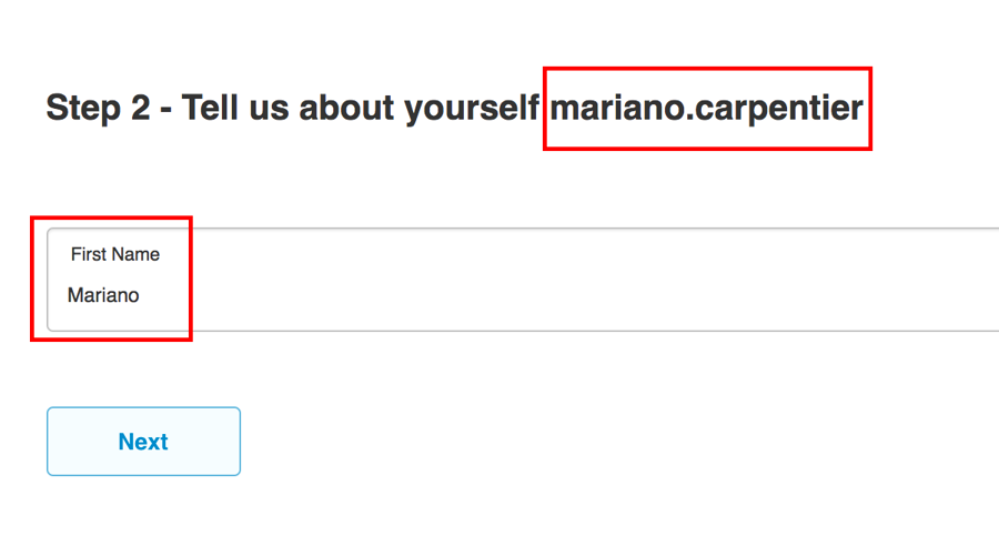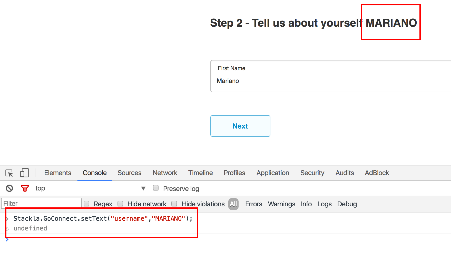 Again, taking the example we created in the first approach, we can take the above and change the data-field-firstname we defined earlier from Mariano to MARIANO using the JS Console in Google Chome