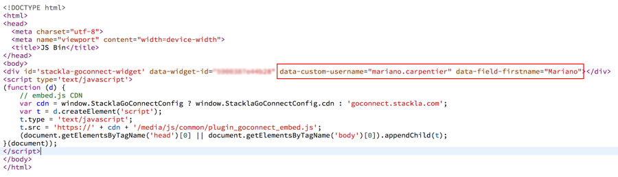 There are two places within the GoConnect form where custom data can be appended. The first is as plain text which is rendered in any part of the GoConnect HTML, the second is as a pre-populated value within one of the fields. As such, to help the form know where this data should live, Nosto's UGC has two custom data prefix types which need to be included in order for the GoConnect form to know where the custom data will go.Plain text values should have the prefix "data-custom-" (ie. data-custom-username) whilst values for the fields should have the prefix "data-field-" (ie. data-field-firstname"). It is important for the field data that the unique parameter (ie. firstname) is consistent with the field names specified in your templates. Both these values should be appended to the DIV class part of the GoConnect embed code as per the screenshot below.