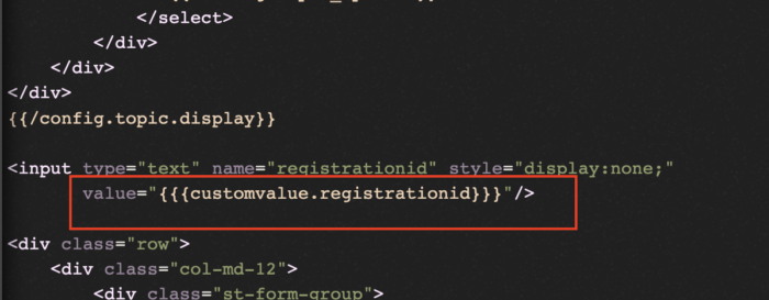 Secondly, to add this variable into the text field or hidden field, you can use the variable - {{{customvalue.registrationid}}}, as shown in the image below
