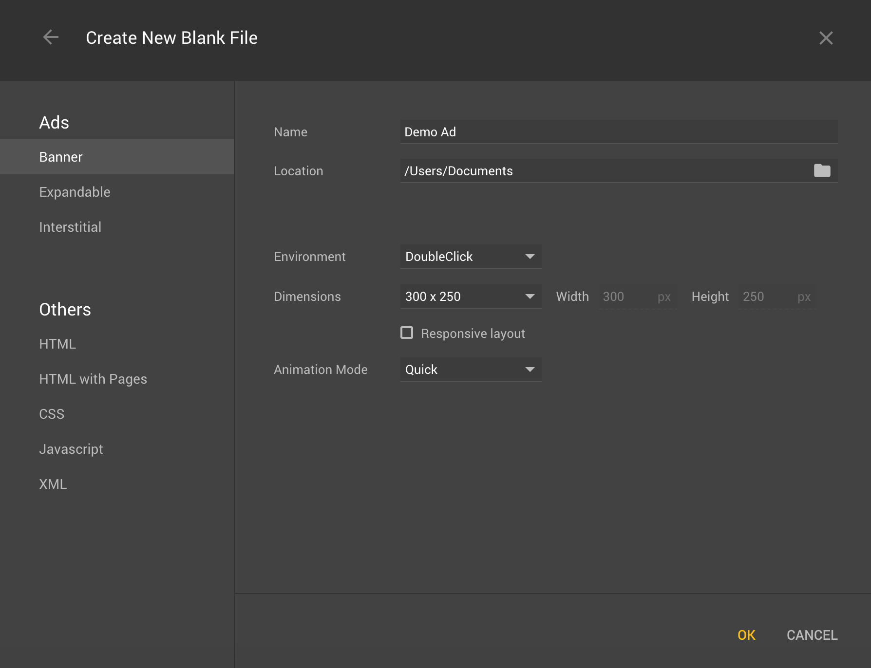 Google Web Designer provides the opportunity for clients to create their own Banner Ads from scratch or use a pre-built ad template. For the purposes of this guide we will create a blank MREC (300x250) banner ad.