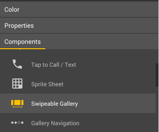 To add a ‘Swipeable Gallery’ simply click on the ‘Components’ section on the Right Hand Size and select the option from the list provided. Once selected you can now drag this onto the canvas into the position you would like the images to render.
