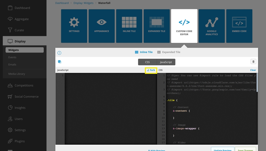 Additionally, you will want to fork the code from the top-right corner of each editor pane. This loads the boilerplate code from the Nosto's UGC codebase copy & paste from our Developer Portal.