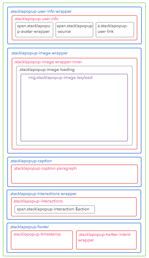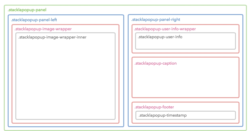 Landscape has more HTML elements than Portrait for layout purpose. They are .stacklapopup-panel, .stacklapopup-panel-left and .stacklapopup-panel-right. All the inner blocks share the same structure as the Portrait layout.