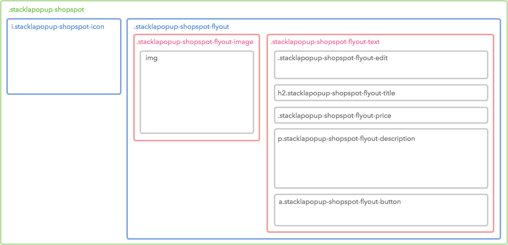 A Shopspot element (.stacklapopup-shopspot) wraps both icon (.stacklapopup-shopspot-icon) and flyout (.stacklapopup-shopspot-flyout). The following diagram shows detailed HTML structure with CSS class names.