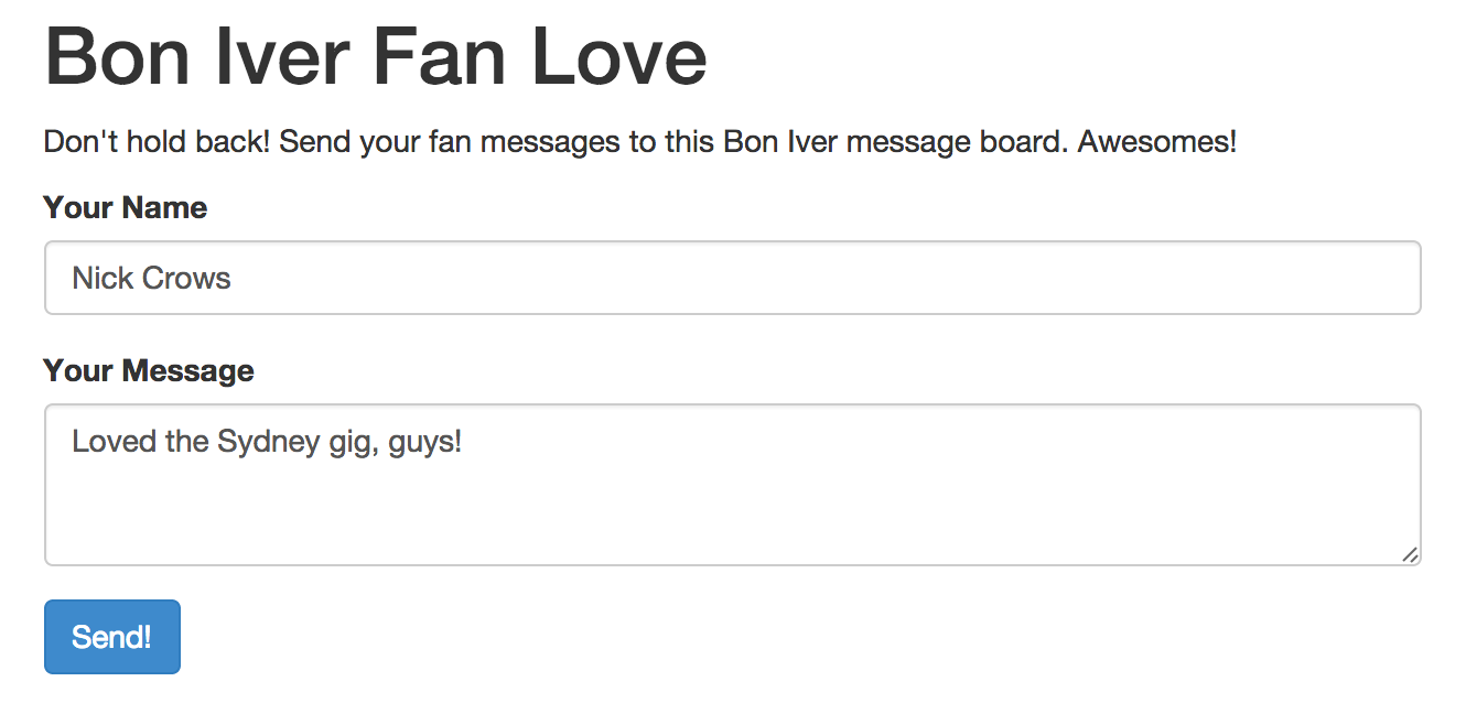 When running a campaign that collects user-generated content (UGC), it's often useful to offer a form for users to post content directly, as well as accept content via Social Media. In this example, we will create a small PHP application that will serve as a View showing the microsite application, and contain a form that will accept a message of fan-love towards Bon Iver, your favorite band.